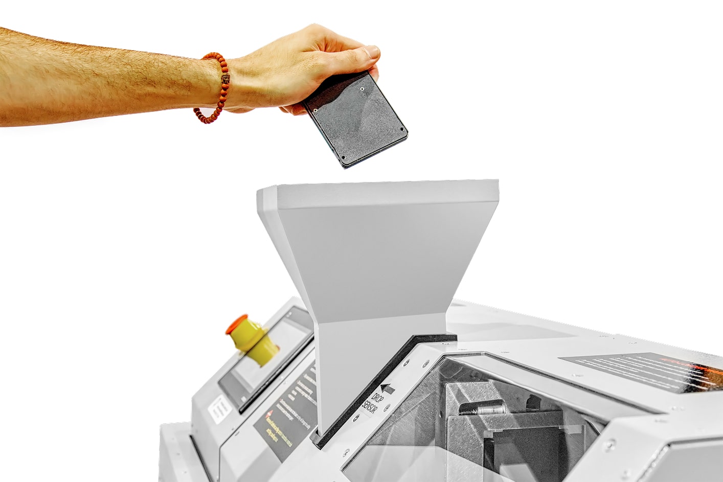 Description: Choose one of our most versatile machines, the MediaDice® All Media Disintegrator A2, to shred items to a 2-millimeter nominal edge length. This shredder accepts all types of media — solid state drives, portable drives, electronics, phones, USB storage, discs and credit cards. Get the features you want to see, such as a 7-inch LCD touch screen, password controls, a cycle counter and a magnetic metal separator.
