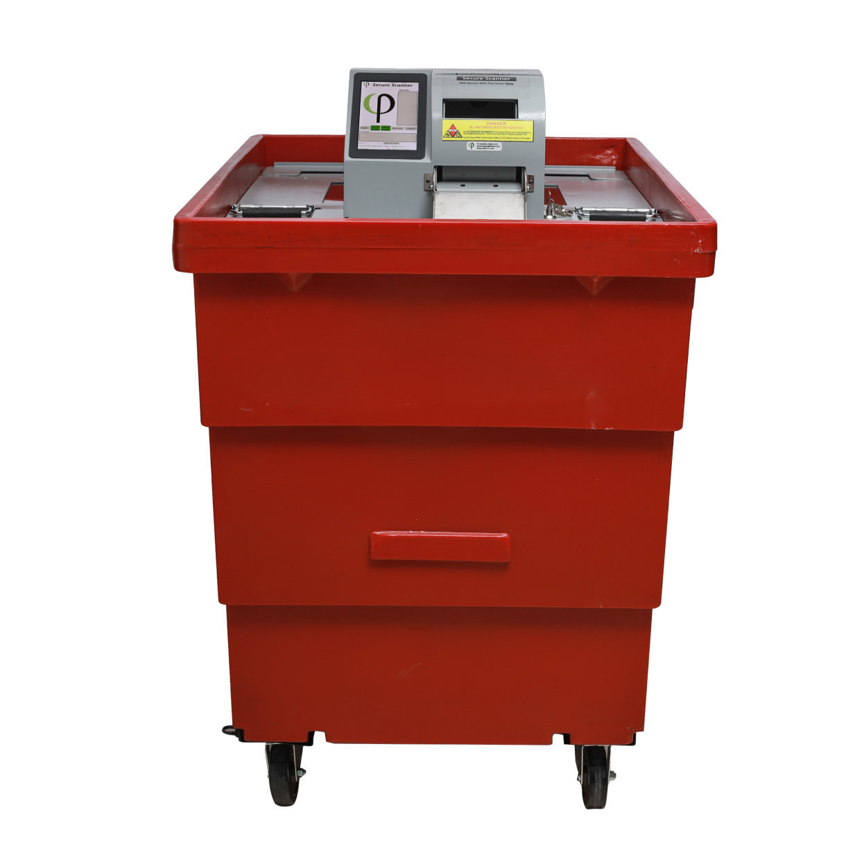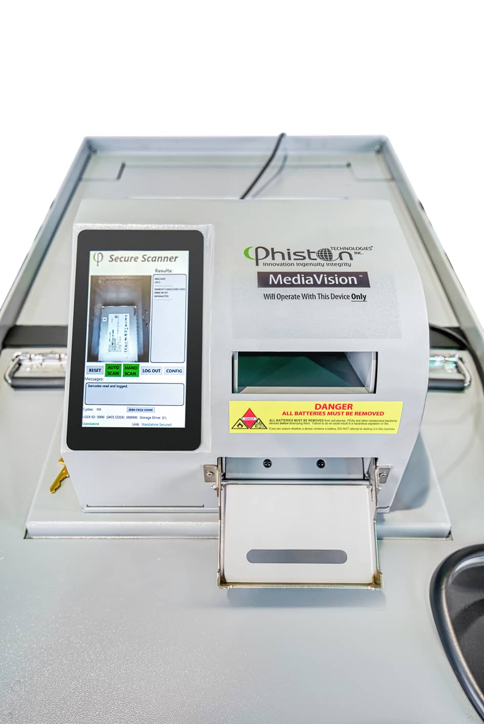- The scanner captures the disk, scans barcodes, and securely transfers it to the crusher.